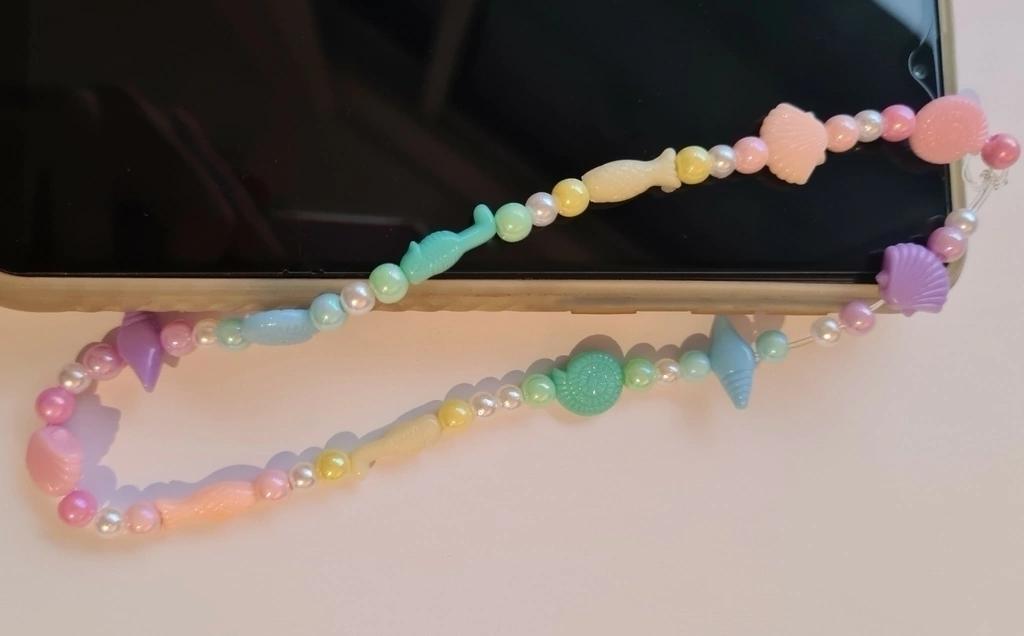 O Phone Strap Mar Doce é muito delicado, feito com formas fofas e cores suaves (candy colors). Perfeito para combinar com capa de celular transparente, branca, rosa, azul, verde, amarela, roxa...